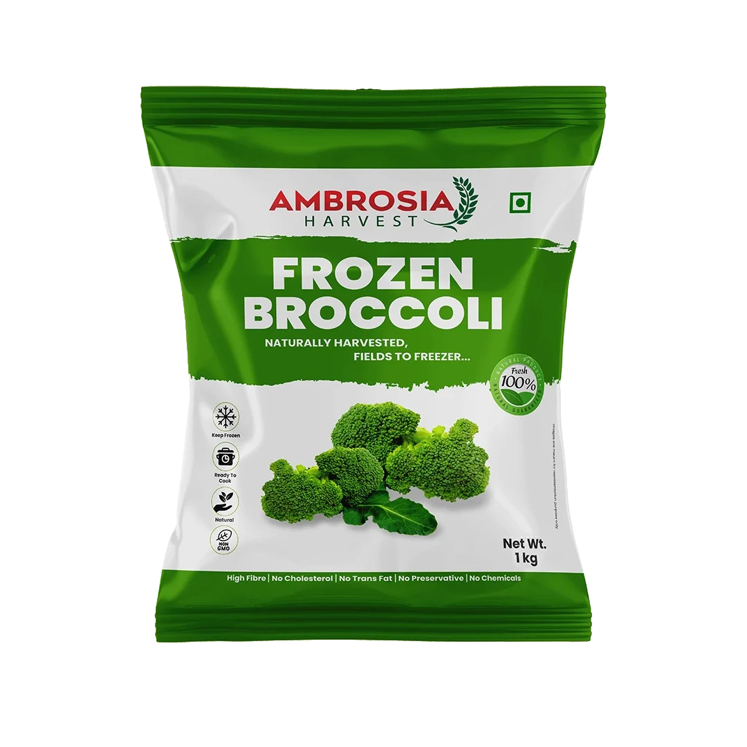 Ambrosia Harvest Frozen Broccoli is made from fresh, premium-quality, non-GMO broccoli sourced directly from trusted farmers. Carefully selected florets are cleaned, trimmed, lightly blanched. And individually quick frozen (IQF) to preserve their natural green color, fresh taste, firm texture, and nutritional value. Free-flowing and ready to cook, this product contains no added salt, sugar, preservatives, or artificial colors.