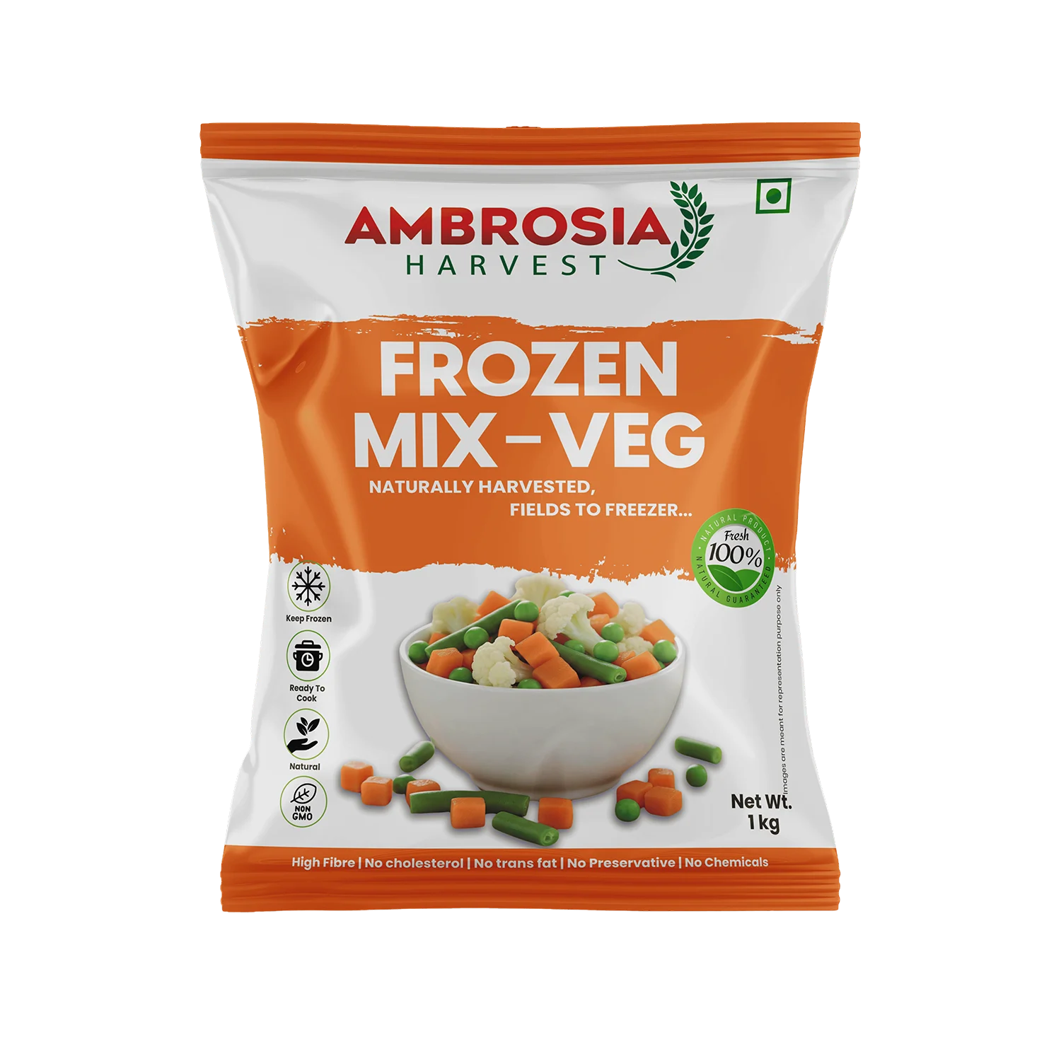 Frozen Mix Veg is prepared from a carefully selected blend of fresh, premium-quality, non-GMO vegetables sourced. It directly from trusted farmers. The mix typically includes carrots, green peas, beans, cauliflower, and sweet corn (as per seasonal availability). All vegetables are cleaned, trimmed, lightly blanched. And individually quick frozen (IQF) to preserve their natural color, taste, texture, and nutritional value. Free-flowing and ready to cook, this product contains no added salt, sugar, preservatives, or artificial colors.
